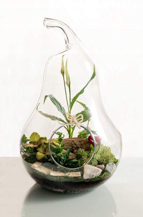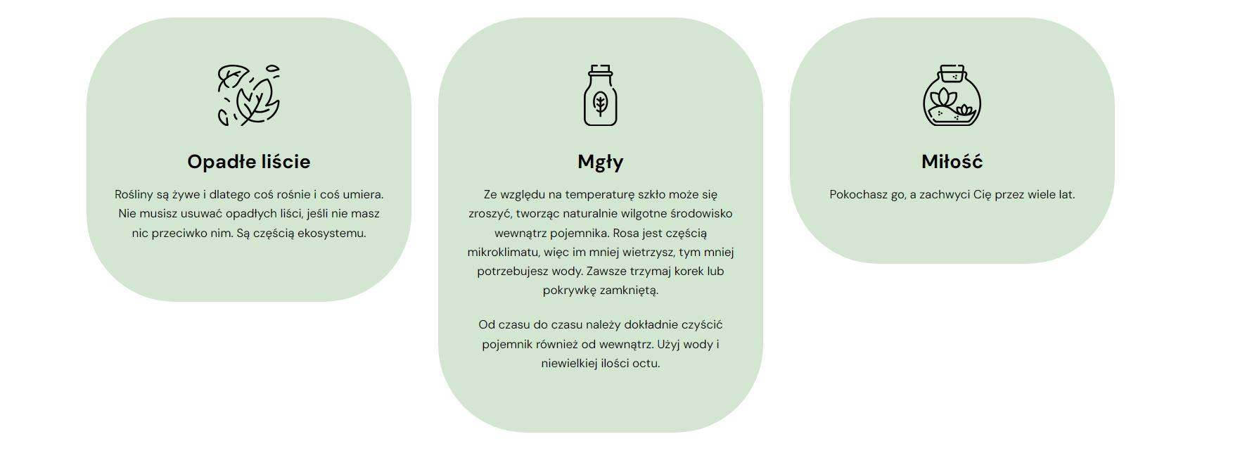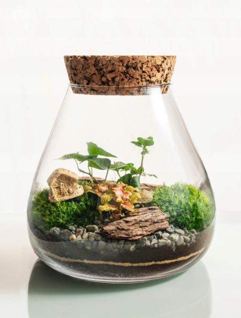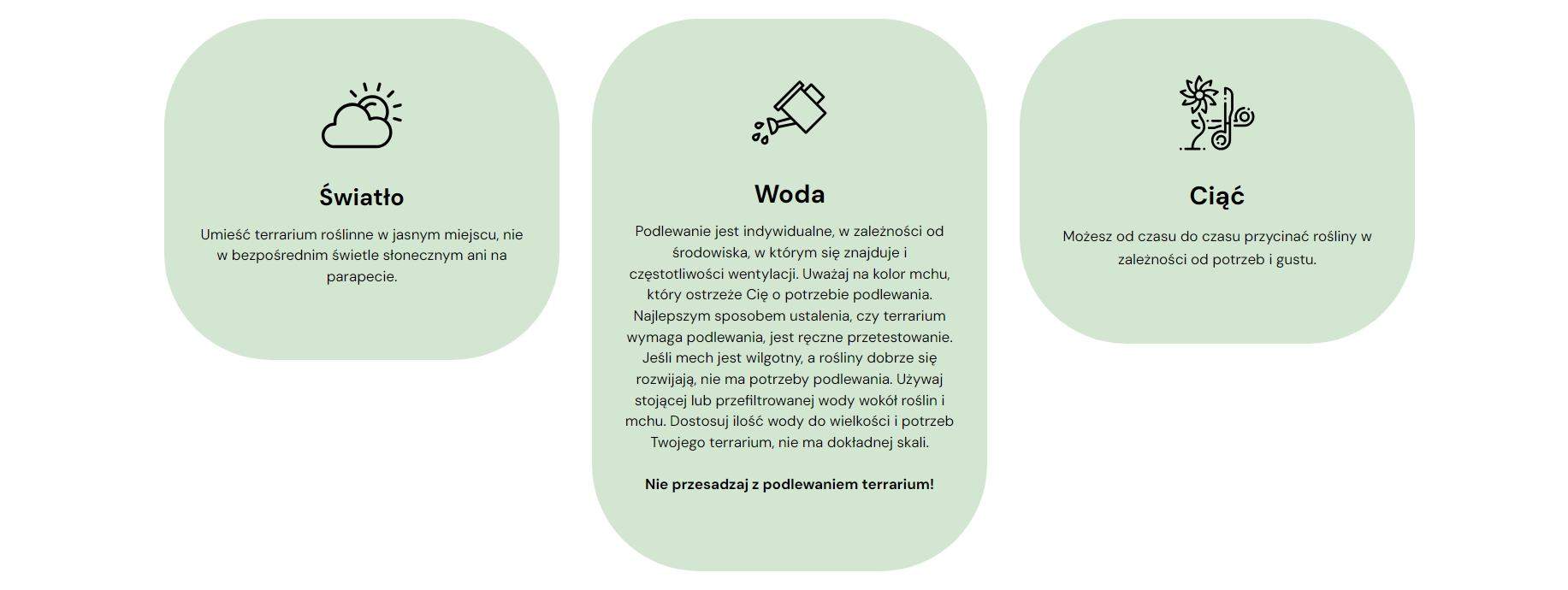 Umieść terrarium roślinne w jasnym miejscu, nie w bezpośrednim świetle słonecznym ani na parapecie. Podlewanie jest indywidualne, w zależności od środowiska, w którym się znajduje i częstotliwości wentylacji. Uważaj na kolor mchu, który ostrzeże Cię o potrzebie podlewania. Najlepszym sposobem ustalenia, czy terrarium wymaga podlewania, jest ręczne przetestowanie. Jeśli mech jest wilgotny, a rośliny dobrze się rozwijają, nie ma potrzeby podlewania. Używaj stojącej lub przefiltrowanej wody wokół roślin i mchu. Dostosuj ilość wody do wielkości i potrzeb Twojego terrarium, nie ma dokładnej skali. Nie przesadzaj z podlewaniem terrarium! Rośliny są żywe, więc naturalne jest, że coś rośnie i coś umiera. Nie musisz usuwać opadłych liści, jeśli nie masz nic przeciwko nim. Są częścią ekosystemu. Ze względu na temperaturę szkło może się zroszyć, tworząc naturalnie wilgotne środowisko wewnątrz pojemnika. Rosa jest częścią mikroklimatu, więc im mniej wietrzysz, tym mniej potrzebujesz wody. Zawsze trzymaj korek lub pokrywkę zamkniętą. Możesz od czasu do czasu przycinać rośliny w zależności od potrzeb i gustu. Od czasu do czasu należy dokładnie czyścić pojemnik również od wewnątrz. Użyj wody i niewielkiej ilości octu.